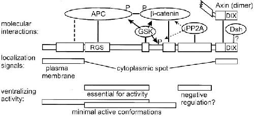 Domains of axin involved in protein-protein interactions, Wnt pathway inhibition, and intracellular localization.