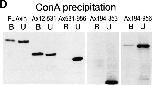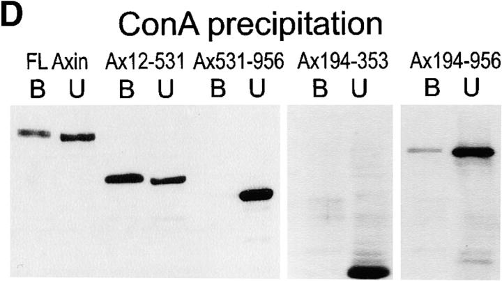 Figure 8. Cell fractionation of Myc–Axin in Xenopus embryos: sedimentability and Con A binding. (A) Diagram of Axin molecule. (B) Myc–Axin is associated with a sedimentable fraction. Homogenates of late blastula embryos were fractionated into a low speed sedimentable fraction (P, pellet), a high speed sedimentable fraction (M, membranes), and a high speed supernatant (S, soluble fraction) as described in Materials and Methods. β-Galactosidase was coexpressed and used as a control for soluble cytosolic proteins. Unlike β-galactosidase, Myc–Axin was sedimentable under these conditions. (C) Myc–Axin is fully extractable in NP-40. Embryos expressing Myc–Axin were extracted in NP-40–containing buffer (sol). The insoluble pellet was reextracted in the presence of SDS (insol, NP-40– insoluble). (D) A pool of Axin is associated with a membrane glycoprotein, and this association requires the NH2-terminal domain. Myc-tagged FL Axin and various Axin mutant constructs were expressed in embryos, and NP-40 extracts were fractionated using Con A beads. Bound fractions (B) were four times concentrated relative to unbound fractions (U). FL Axin showed significant association with Con A beads that indicates a stable interaction with a membrane glycoprotein. Stronger binding was observed for the NH2-terminal fragments Ax12-531. On the other hand, constructs lacking the NH2-terminal domain showed no (Ax-531-956 and Ax194-353) or very weak binding (Ax194-956). |