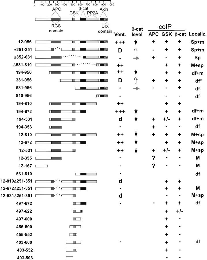 Axin was identified as a regulator of embryonic axis induction in vertebrates that inhibits the Wnt signal transduction pathway. Epistasis experiments in frog embryos indicated that Axin functioned downstream of glycogen synthase kinase 3beta (GSK3beta) and upstream of beta-catenin, and subsequent studies showed that Axin is part of a complex including these two proteins and adenomatous polyposis coli (APC). Here, we examine the role of different Axin domains in the effects on axis formation and beta-catenin levels. We find that the regulators of G-protein signaling domain (major APC-binding site) and GSK3beta-binding site are required, whereas the COOH-terminal sequences, including a protein phosphatase 2A binding site and the DIX domain, are not essential. Some forms of Axin lacking the beta-catenin binding site can still interact indirectly with beta-catenin and regulate beta-catenin levels and axis formation. Thus in normal embryonic cells, interaction with APC and GSK3beta is critical for the ability of Axin to regulate signaling via beta-catenin. Myc-tagged Axin is localized in a characteristic pattern of intracellular spots as well as at the plasma membrane. NH2-terminal sequences were required for targeting to either of these sites, whereas COOH-terminal sequences increased localization at the spots. Coexpression of hemagglutinin-tagged Dishevelled (Dsh) revealed strong colocalization with Axin, suggesting that Dsh can interact with the Axin/APC/GSK3/beta-catenin complex, and may thus modulate its activity.
