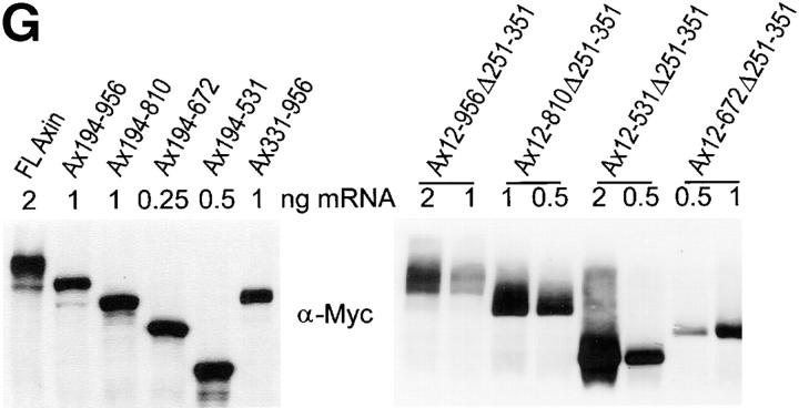 Figure 4. Ventralization and dorsalization by expression of Axin mutants in Xenopus embryos. (A) Diagram of Axin molecule. The main binding domains are indicated as well as the aa numbers corresponding to most restriction sites used in the generation of mutant Axin constructs. (B) Examples of ventralized embryos (tailbud stage) obtained by dorsal injection of Ax194-672 mRNA. Two embryos have greatly reduced axes (arrowheads) and no head. The other four embryos are completely ventralized (i.e., they lack dorsal structures and have no body axis). (C) Embryos expressing Ax531-956 develop normally. (D) Examples of hyperdorsalized embryos obtained by dorsal expression of Ax331-956. These embryos have enlarged heads and cement glands (large arrows) or double cement glands (small arrows). (E) Partially dorsalized embryos resulting from dorsal expression of Ax194-531. These embryos typically form very large semicircular cement glands (arrows) and their heads are generally strongly disorganized (arrowheads). (F) Axis duplication by ventral expression of Ax331-956. Most of the embryos form complete twin embryos, including two cement glands (arrows). (G) Expression levels of FL and mutant Axin constructs in embryos. (Left) An example of a series of constructs expressed dorsally. (Right) Expression levels of a series of constructs with internal deletion of the RGS domain, expressed ventrally. Note that 1–2 ng Ax12-956Δ251-351 mRNA induced complete duplicated axes (see Table II), whereas the other constructs expressed at similar or even higher levels induced mostly partial or no secondary axis. |