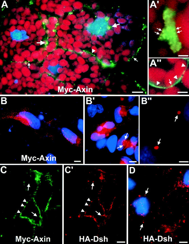 Figure 6. Myc-tagged Axin localizes in discrete spots and colocalizes with HA–Dsh. (A) Cellular distribution of FL Myc–Axin (green, Alexa488 staining) in Xenopus blastulae, detected by indirect IF on frozen sections. Myc–Axin localized mainly in spots (small arrows) or clusters of spots (large arrows), found generally but not exclusively at the cell periphery. Some plasma membrane staining was also observed (arrowhead). Red shows yolk platelets counterstained with Eriochrome Black; blue shows the nuclei (DAPI staining). (A′) Large cluster of Myc–Axin-positive spots (arrows) at higher magnification. (A′′) Detail of membrane localization of Myc–Axin (arrowheads). Spots also are found at or near the cell surface (arrow). (B and B′) Localization of FL Myc–Axin in transfected HeLa cells. Myc–Axin (red, Cy3 staining) is found in spots, mostly at the cell periphery. In high expressing cells, bright cytoplasmic clusters were observed (B′, arrows). (B′′) Detail of two clusters at high magnification (arrows). Note that images in A and A′′ and B and B′′ were collected under very different conditions (exposure, filters), since the signal was one order of magnitude stronger in transfected HeLa cells compared with mRNA-injected embryos. Blue shows the nuclei (DAPI staining). (C and C′) Colocalization of FL Myc–Axin and HA–Dsh. Coexpressed Myc–Axin (green, Alexa488 staining) and HA–Dsh (red, Cy3 staining) were detected on sections from Xenopus blastulae by double IF. All Myc–Axin colocalized perfectly with HA–Dsh (arrowheads), but some HA–Dsh spots did not stain for Myc–Axin (arrows). Note that most Axin-Dsh spots are distributed along the periphery of the cells. (D) Localization of HA–Dsh expressed alone: Dsh (red, Cy3 staining) localizes in spots, distributed throughout the cytoplasm. Blue shows nuclei (DAPI). Bars: (A) 10 μm; (A′) 2 μm; (A′′) 5 μm; (B and B′) 10 μm; (B′′) 5 μm; (C and D) 20 μm. |