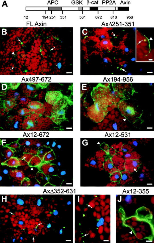 Figure 9. Sequence specific patterns of cellular distribution of Axin mutants. FL and various mutant forms of Myc-tagged Axin were expressed in Xenopus embryos and localized by IF (green) on frozen sections. Diagram of Axin molecule. (B and C) FL and AxΔ251-351 localized preferentially to spots or clusters of spots (arrows). Variable membrane staining was detected in some cells (B and insert C, arrowheads). This pattern was found for all constructs containing both NH2- and COOH-termini. (D) Diffuse cytoplasmic distribution of Ax497-672 found in most constructs lacking the NH2 terminus. (E) Example of a mutant (Ax194-956) showing a cytoplasmic, but somewhat particulate, distribution with some weak enrichment at the cell periphery (arrowhead). Partial cell surface enrichment is characteristic of mutants lacking the NH2 terminus but with intact APC and GSK3β-binding sites. (F and G) Constructs containing the NH2 terminus but lacking the COOH terminus, such as Ax12-672 and Ax12-531, are mainly localized at the plasma membrane (arrowheads). Some intracellular punctate staining is also observed (arrows). (H) Localization of AxΔ352-631 mimics the punctate staining of FL Axin (arrows). (I and J) High magnification views of punctate staining (I, AxΔ352-631) and membrane staining (J, Ax12-355). Bars: (A–G) 20 μm; (H, I, and insert B) 5 μm. |