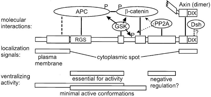 Figure 10. Axin domains, molecular interactions, and their functions. Binding domains are represented by boxes and direct molecular interactions are indicated by thick lines. Axin, APC, and β-catenin can bind to each other and form a triangular complex. A secondary AxinâAPC interaction is shown by a dashed line. GSK3β binding to Axin is required for phosphorylation (arrows and P) of Axin itself, as well as APC, and β-catenin. Phosphorylation of APC regulates APC-β-catenin binding and phosphorylation of β-catenin is required for its degradation. The function of Axin phosphorylation is not known. The catalytic subunit of PP2A binds to a site adjacent to the β-catenin binding site and may counteract the activity of GSK3β (dotted lines with arrows). The COOH terminus contains a dimerization domain, whose function is unclear. Binding to Dsh (dotted line) is suggested by the presence of a DIX domain in both molecules and by colocalization with Axin. Localization of Axin depends on its NH2-terminal and COOH-terminal sequences. The NH2 terminus is required for both plasma membrane and cytoplasmic spot localization, whereas the COOH terminus enhances localization at spots. The RGS domain and GSK3β binding site are required for ventralizing activity. A segment of Axin including the RGS, GSK3β and β-catenin binding domains is sufficient for activity. However, the NH2 terminus can substitute for the β-catenin binding domain, possibly by stabilizing an Axinâ¢APCâ¢Î²-catenin complex in the absence of direct Axinâβ-catenin binding. |