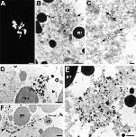 Figure 7. Electron microscopic localization of Myc– Axin. (A–C) EM localization of FL Myc–Axin by on-section staining on Lowycryl sections. (A) Low magnification view of an Axin-positive cluster detected by indirect IF on a thin section. Axin expression in this cell is relatively low and individual spots can be resolved (arrows). (B) Low magnification EM image of a cluster of gold particles (15 nm) labeling an area of dense cytoplasm (arrows) containing numerous vesicles (asterisks). Note that outside the cluster the surrounding cytoplasm is devoid of gold particles. (C) High magnification view of portion of a less dense cluster. The cluster is composed of small groups of gold particles decorating electron dense cytoplasm (arrows) associated with a few vesicles (asterisks). Each small group probably corresponds to a single “spot” observed by IF (A and Fig. 6, A and B). Note that the membranes surrounding the vesicular structures appear much less contrasted in B and C compared with E. This is due to the difference in the methods used (low contrast Lowycryl sections in B and high contrast conventional Spurr sections in D). (D and E) EM localization of Myc–Axin by preembedding Nanogold labeling and silver enhancement. (D) Low magnification view of a Myc–Axin positive area (arrow) in a high expressing cell. Single gold aggregates found both in the cytoplasm and in the nucleus (n) represent background that is higher with this preembedding technique. The arrowhead points to the plasma membrane that shows no significant staining in this cell. (E) High magnification view of a similar area, packed with vesicles of variable size (∼50-200 nm) embedded in electron dense cytoplasm. The irregular shape of the gold/silver particles is due to the silver enhancement method. Insert shows enlarged view (2×) of the outlined area, with tightly-packed vesicles (asterisks) and electron dense cytoplasm (arrow). Note that gold labeling tends to be somewhat excluded from the areas particularly packed with vesicles. This could be due to limited diffusion of Nanogold in these preparations. (F) Nanogold localization of Myc–Axin at the plasma membrane. Because FL Axin localization at the membrane is weak (D, and Fig. 7 A), a mutant Axin, AxΔ531-810 was used in this experiment. In this case, the plasma membrane is heavily decorated with gold/silver particles (arrowheads). m, mitochondrion; p, pigment granules; and yp, yolk platelets. Bars: (A) 2 μm; (B) 1 mm; (C) 0.2 μm; (D) 1 μm; (E) 0.5 μm; (F) 1 μm. |