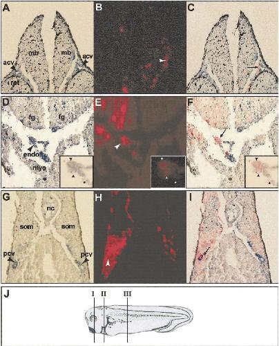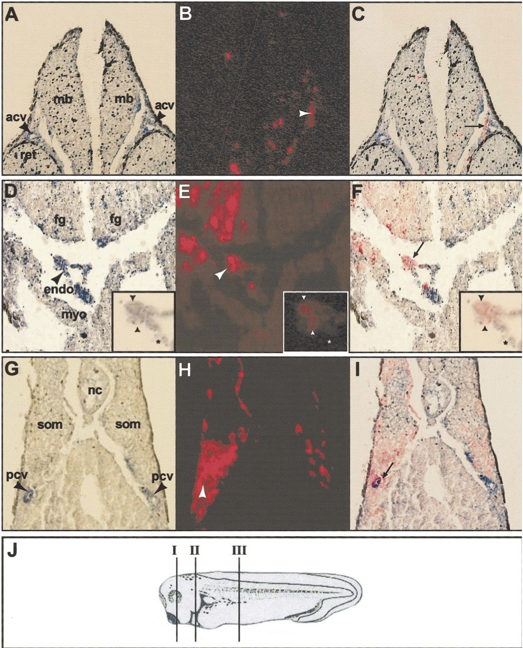 FIG. 3. Colocalization of X-msr signal and RLDx. Following in situ hybridization with an X-msr probe, embryos were embedded in wax, transversely sectioned, and then analyzed for the presence of both X-msr and RLDx. Black arrowheads (A, D, and G) indicate X-msr signal in anterior cardinal veins, endocardium, and posterior cardinal veins, respectively; white arrowheads (B, E, and H) indicate the same location when viewed under fluorescence. Black arrows (C, F, and I) show overlay of X-msr signal with fluorescence in the identical location. (A, B, and C) Examples of X-msr staining in the anterior cardinal veins colocalizing with RLDx from blastomere D2.2. (A) X-msr signal in anterior cardinal vein, (B) fluorescence in the same section, and (C) an overlay of both images showing colocalization. (D, E, and F) Examples of X-msr staining in the endocardium colocalizing with RLDx from blastomere D1.1. (D) X-msr signal, (E) fluorescence in the same section, and (F) an overlay of both images. Insets represent an enlargement of the upper left region of the endocardium showing X-msr signal (C), fluorescence (D), and overlay (E). Arrowheads in the insets point to two cells showing both X-msr signal and fluorescence; directly to the right of the asterisk is depicted a cell that shows X-msr signal but does not show fluorescence colocalization. (G, H, and I) Examples of X-msr signal in the posterior cardinal vein colocalizing with RLDx signal from blastomere V2.2. (G) X-msr signal, (H) fluorescence in the same section, and (I) an overlay of both images. For A, dorsal is toward the top of the page. Magnification for A is 250x, D is 400x, G and H is 200x, and I is 180x. Note that the magnification of G and H is slightly greater than that of I. (J) Schematic indicating planes of section: I (A, B, C), II (D, E, F), and III (G, H, I). Diagram adapted from Nieuwkoop and Faber (1967). acv, anterior cardinal vein; endo, endocardium; fg, foregut; mb, midbrain; myo, myocardium; nc, notochord; ret, retina; som, somite; pcv, posterior cardinal vein. |