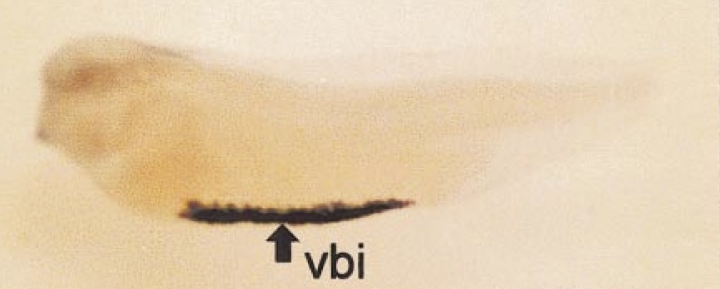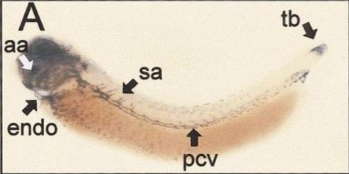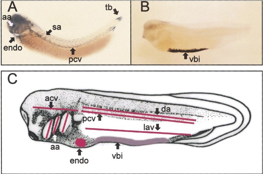 FIG. 2. Identification of vascular structures and ventral blood islands. Whole-mount in situ hybridization was performed on hatching- stage embryos (stage 33/34) using (A) X-msr to identify vascular tissue and (B) Beta-globin to identify the ventral blood islands. (C) Schematic diagram indicating the location of structures examined in this study. aa, aortic arches; acv, anterior cardinal vein; da, dorsal aorta; endo, endocardium; lav, lateral abdominal vein; pcv; posterior cardinal vein; sa, somitic arteries; tb, tailbud; vbi, ventral blood islands. |