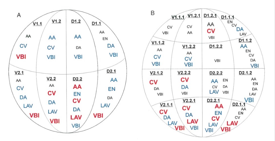 FIG. 5.Schematic summary of fate map for (A) the 16-cell- and (B) the 32-cell-stage embryos. The embryos schematically depict theprogeny of each of the blastomeres of the 16- and 32-cell-stage embryos. The percentage of injected embryos for a given blastomere thatcontributed to a specific tissue is indicated as follows: Structures denoted in large bold red letters indicate that 75â100% of the injectedblastomeres contributed to that structure; structures shown in large blue letters denote that 50 â74% of the injected embryos contributeprogeny to that structure; structures shown in small black letters indicate that 25â 49% of the injected blastomeres contributed progenyto the structure.366Mills, Kruep, and SahaCopyright © 1999 by Academic Press. All rights of reproduction in any form reserved.