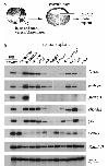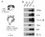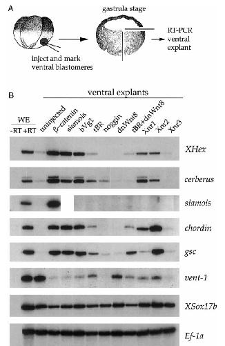 FIG 2. Anterior endomesoderm is specified by blastula stage. (A) Schematic diagram showing the experimental design. At the 4-cell stage, the dorsal blastomeres, which are lighter and smaller, are marked with Nile blue vital dye. At stage 7â8 the dorsal-vegetal tissues are explanted, free of mesoderm, and cultured until stage 10.5 when they are subjected to RT-PCR. (B) RT-PCR analysis of XHex, cerberus, XSox17Beta, gsc, Xbra, and Ef-1alpha expression in whole embryos stage 8 (WE st8) and stage 10.5 (WE st10.5), dorsal endoderm explants at stage 10.5 (DE), and a whole embryo stage 10.5 control cDNA with no reverse transcriptase (WE -RT). Mesoderm-free dorsal-vegetal explants that do not express Xbra do express XHex or cerberus. |