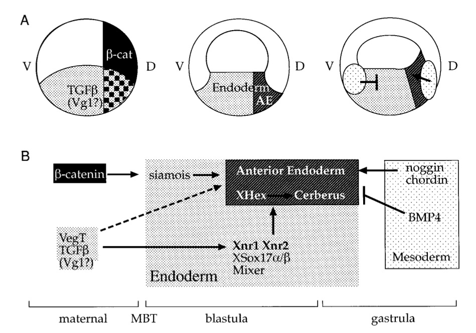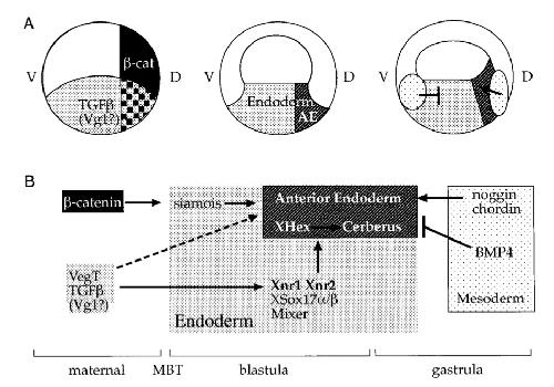 FIG. 8. Model of anterior endomesoderm development. Based on our results we propose the following model of anterior endomesoderm development. (A) Spatial arrangement of signalling domains in the embryo (V, ventral, and D, dorsal). (B) Signalling molecules involved. The model is presented in three temporal phases indicated along the bottom: (1) maternally acting factors, (2) zygotic factors acting after the midblastula transition (MBT) during the blastula stage, and (3) signals acting during the gastrula stage. The combination of the maternal Wnt/ô°-catenin (dorsal, black) and vegetal/endodermal TGF-ô° (grey) signals initially determines the site of the future AE, where their activities overlap (chequered). After the MBT, siamois mediates the ô°-catenin signal, and factors such as Xnr1-2, XSox17ô°/ô°, and Mixer (and possibly the continued activity of maternal Vg1; dashed arrow) mediate the endoderm-specific signals. As a result XHex and cerberus transcription is activated in the AE. Within the AE, the activity of the XHex protein promotes cerberus expression. Finally, at the gastrula stage, noggin and chordin secreted from the organiser (stippled, dorsal) promote the expression of XHex and cerberus by inhibiting the effects of ventral BMP4 signals (stippled, ventral). |
