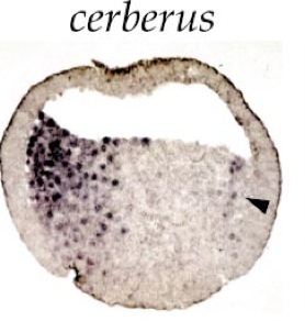 cer1 (cerberus) gene expression in bisected Xenopus laevis embryo, mid-sagittal section, assayed via in situ hybridization, NF stage 10.25, dorsal lip bottom left. (Black arrow indicates the ventral mesendoderm boundary) |