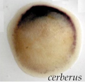 cer1 (cerberus) gene expression in bisected Xenopus laevis embryo, assayed via in situ hybridization, NF stage 10.25, vegetal view, dorsal up. |