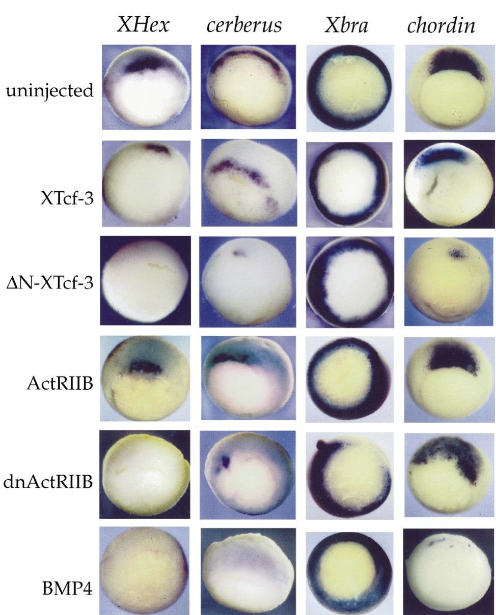 FIG. 6. Dorsal Beta-catenin, TGF-Beta, and BMP-antagonist signalling pathways are required for endogenous XHex and cerberus expression. We tested whether the following signalling pathways are required for XHex and cerberus expression: (1) the maternal Wnt/beta-catenin pathway, (2) the dorsalising TGF-Beta signals, and (3) the dorsalising BMP antagonists noggin and chordin. Each of the pathways was blocked by the overexpression of dominant-inhibitory components of the respective pathways. Synthetic mRNA encoding deltaN-XTcf-3, 0.5 ng; XTcf-3, 0.5 ng; dnActRIIB, 1 ng; ActRBII, 1 ng; or BMP4, 1 ng was microinjected subequatorially into the two dorsal blastomeres at the 4-cell stage. At stage 10 0.5 embryos were subjected to whole-mount in situ hybridisation with XHex, cerberus, Xbra, and chordin probes. Representative embryos are shown in each case. The mRNA injected is indicated along the left and the in situ probe is indicated on the top. Inhibition of Beta-catenin or TGF-Beta signalling as well as over-expression of BMP4 blocked endogenous XHex and cerberus expression. Control injections of ActRIIB and XTcf-3 had no effect.