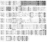 Amino acids shared by all four proteins are boxed. Dashes indicate