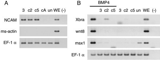 induced by Bmp4. Injection of 1 ng of cmXnrs RNA did not induce Xbra, Xwnt8, or msx-1 expression.