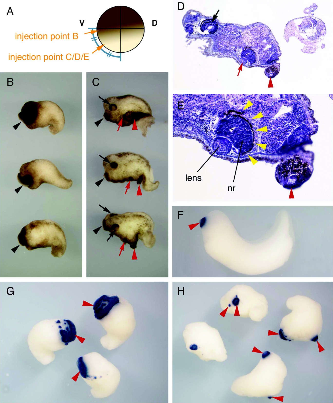 Figure 1. cmXnr5 induced a hyperplastic cement gland or an ectopic head structure formation with a single eye and a cement gland. A: Scheme of the injection points of cmXnr5 RNA. The injection point B is the marginal region of two ventral-vegetal blastomeres near the ventral cross point of the first and the third cleavage lines. The injection point C/D/E is the approximately half region between the vegetal cross point of the first and the second cleavage lines and the ventral cross point of the first and the third cleavage lines in both ventral-vegetal blastomeres at 8-cell stage. Each injection point is correspondent to B or C/D/E, respectively. B: Embryos were injected with 500 pg of cmXnr5 RNA into the marginal region (injection point B). Embryos had shortened body axis and a hyperplastic cement gland (arrowhead). C: Embryos were injected with 1 ng of cmXnr5 RNA into the prospective ventral endoderm region (injection point C/D/E). Embryos had an ectopic eye (red arrow) and a cement gland (red arrowhead) at stage 40. The original eye and cement gland are indicated by the black arrow and arrowhead, respectively. D: Histological section of the embryo injected with 1 ng of cmXnr5 RNA into the prospective ventral endoderm region. An ectopic eye (red arrow) and a cement gland (red arrowhead) were observed in the ventral region. E: The embryo in D at high magnification. The ectopic eye showed normal structure with retinal pigment epithelium (yellow arrowhead), neural retina (nr), and lens. F-H: The expression of cement gland marker XCG1. F: An uninjected albino embryo stage 35. G: Embryos injected with 1 ng of cmXnr5 RNA into the marginal region (injection point B). H: Embryos injected with 1 ng of cmXnr5 RNA into the prospective ventral endoderm region (injection point C/D/E). Whole-mount in situ hybridization was performed according to Harland ([1991]). |