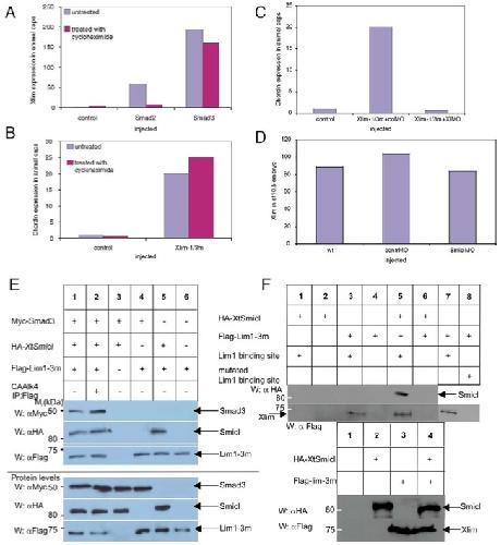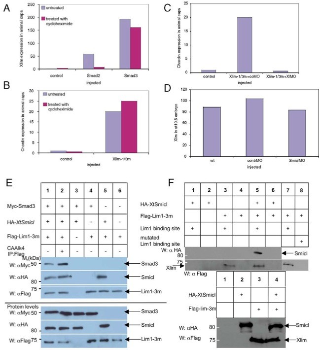 Fig. 7. Smad3 induces expression of Xlim1 in a direct manner; induction of Chordin by Xlim1-3m requires Smicl. (A) Smad3 but not Smad2 is a direct inducer of Xlim1. The experimental regime was identical to that described in Fig. 6A, except that expression of Xlim1 and not Chordin was analysed by quantitative RT-PCR. (B) Xlim1/3m is a direct inducer of Chordin. RNA encoding Xlim1/3m (400 pg) was injected into embryos of Xenopus laevis at the one-cell stage. Animal caps were dissected from such embryos and cultured in control medium or medium containing cycloheximide, as described in Fig. 6A. Induction of Chordin is not inhibited by cycloheximide. (C) Smicl is required for Xlim1/3-mediated induction of Chordin. RNA encoding Xlim1/3m (400 pg) was injected into embryos at the one-cell stage in the presence of 80 ng morpholino oligonucleotide coMO or XlMO. Animal pole regions were dissected from such embryos at mid blastula stage 8 and cultured until control embryos reached stage 11. (D) Smicl is not required for expression of Xlim1 in Xenopus laevis. Morpholino oligonucleotides XlMO or coMO (80 ng) were injected into Xenopus laevis embryos at the one-cell stage and RNA was extracted at early gastrula stage 10.5. Expression of Xlim1 is not inhibited by XlMO. (E) Smicl and Xlim1/3 can interact. The indicated combinations of expression constructs encoding HA tagged XtSmicl, Flag tagged Xlim1/3m, Myc tagged Smad3 and caALK4 were co-transfected into HEK 293T cells. Extracts were subjected to immunoprecipitation using an anti-Flag antibody and the presence of HA XtSmicl was analysed by western blotting by using an anti-HA antibody. Smad3 can bind Xlim1/3 in a Smic1-dependent fashion as shown by western analysis of Xlim1/3 immunoprecipitates using an anti-Myc antibody. (F) Binding of Flag-tagged Xlim and HA-tagged Smicl to Chordin promoter sequences containing Xlim-binding sites. Extracts of HEK293T cells transfected with Xlim and/or Smicl expression constructs were incubated with streptavidin-agarose beads and biotinylated double-stranded oligonucleotides. Upper panel: precipitated complexes were subjected to western blotting using anti-Flag and anti-HA antibodies. Xlim1, but not Smicl, interacts with this region of the Chordin promoter, but Smicl can form part of a ternary complex with the Chordin promoter region and Xlim1. Xlim does not bind to Chordin promoter oligonucleotides with mutations in the Xlim-binding sites (see Materials and methods). Lower panel: western blotting of whole extracts shows similar expression levels of Flag-tagged Xlim and HA-tagged Smicl.