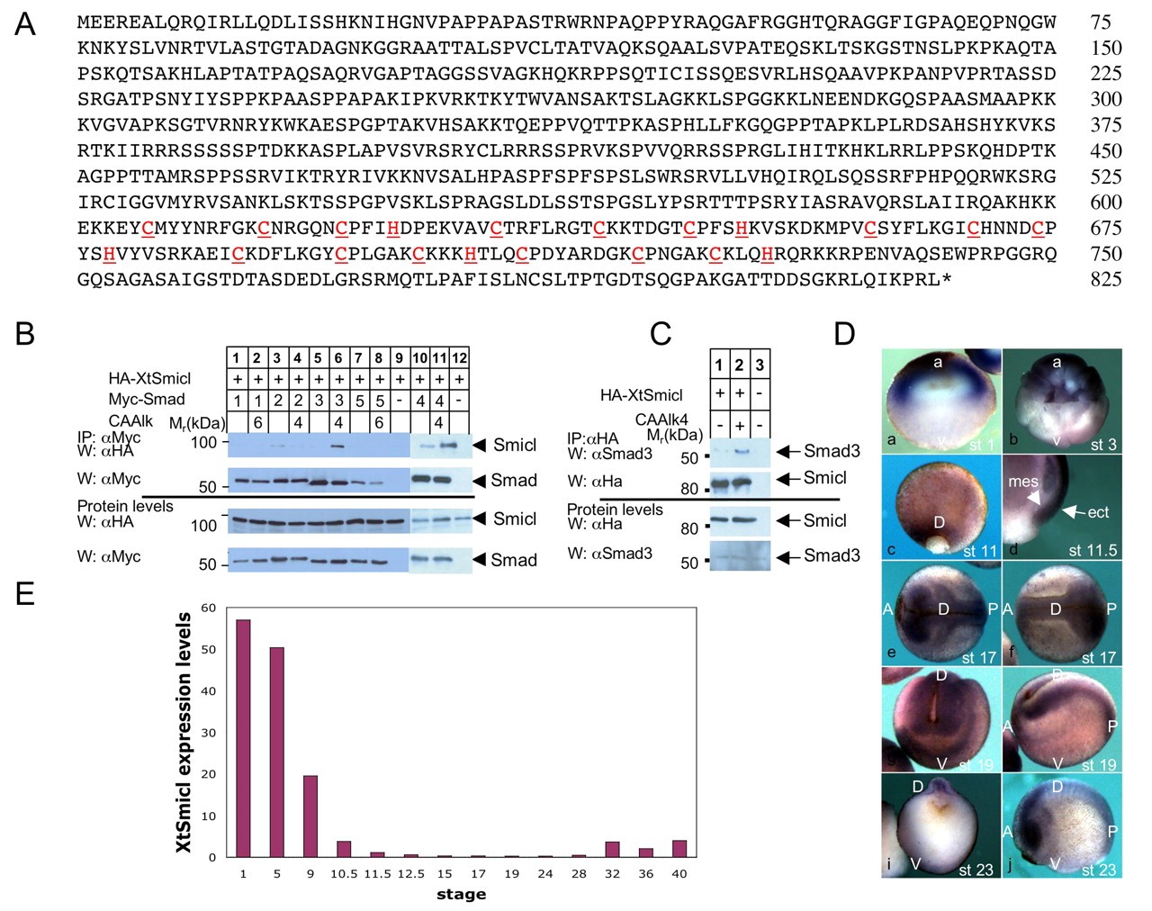 Fig. 1. Smicl is a Smad-interacting protein that is expressed maternally and then zygotically during Xenopus development. (A) Amino acid sequence of XtSmicl, a novel Smad interacting protein. Conserved cysteines and histidines in the zinc fingers are underlined. (B) Smicl interacts with Smad3 and Smad4. HA-tagged XtSmicl was expressed in HEK293T cells with plasmids encoding Myc-tagged Smad1, Smad2, Smad3, Smad4 or Smad5 in the presence or absence of the appropriate constitutively active type I receptor. Samples were immunoprecipitated (IP) using an anti-Myc antibody and the presence of HA-XtSmicl was analysed by western blotting (W). (C) Smicl interacts with endogenous Smad3. HA-tagged XtSmicl was expressed in HEK293T cells in the presence or absence of caALK4. Samples were immunoprecipitated with anti-HA coupled beads and the presence of endogenous Smad3 was analysed by western blotting. (D) Expression pattern of Xenopus tropicalis Smicl studied by whole-mount in situ hybridisation. Stages (st) are indicated. a, animal; v, vegetal; D, dorsal; V, ventral; A, anterior; P, posterior; mes, mesoderm; ect, ectoderm. Smicl is expressed maternally and transcripts are particularly abundant in the animal hemisphere of the fertilised egg. These results were confirmed by in situ hybridisation experiments carried out on bisected embryos to facilitate penetration of the probe in the vegetal hemisphere of the embryo. In situ hybridisation using a sense probe revealed no background staining (data not shown). (E) Quantitative RT-PCR confirms the presence of high levels of Smicl RNA in the fertilised egg of Xenopus tropicalis. Significant zygotic expression of Smicl begins at tadpole stage 32.