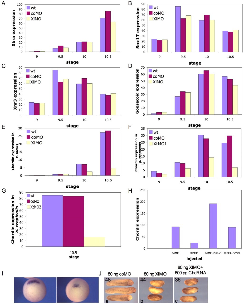 Fig. 3. Inhibition of Smicl function causes down regulation of Chordin expression, but not of other mesodermal and endodermal markers. (A-E) Expression levels, normalised to that of ornithine decarboxylase, of Xbra (A), Sox17 (B), Xnr3 (C), Goosecoid (D) and Chordin (E) in uninjected embryos, embryos injected with morpholino oligonucleotide coMO (80 ng), or embryos injected with morpholino oligonucleotide XlMO (80 ng). RNA was extracted at the indicated stages, and RNA levels were analysed by quantitative RT-PCR. (F,G) Inhibition of Smicl function by means of morpholino oligonucleotide XtMO1 (5 ng; F) or XtMO2 (30 ng; G) also causes downregulation of Chordin expression in Xenopus tropicalis. Embryos were assayed at stages 9, 9.5, 10 and 10.5 (F), or at stage 10.5 (G). (H) Injection of RNA encoding mouse Smicl causes the upregulation of Chordin in embryos injected with morpholino oligonucleotide coMO and rescues the downregulation of Chordin caused by morpholino oligonucleotide XlMO. Embryos were injected with the indicated RNAs (1 ng) or morpholino oligonucleotides (50 ng). RNA was extracted at stage 10.5 and expression of Chordin and ornithine decarboxylase was assayed by quantitative RT-PCR. (I) In situ hybridisation of Xenopus laevis embryos at the early gastrula stage confirms that inhibition of Smicl function causes the downregulation of Chordin. The embryo on the left was injected with coMO (80 ng; n=15) and the one on the right with XlMO (80 ng; n=15). (J) Injection of Chordin mRNA can partially rescue the phenotype caused by XlMO. Numbers indicate how many embryos out of 50 display this phenotype.