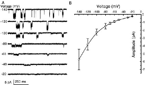 Figure 2. The current–voltage relationship of single channel currents. (A) Single channel currents of an outside-out patch from HEK 293 cells activated by 2 μM ATP (1 mM extracellular Mg2+ and Ca2+ at different membrane potentials, symmetrical Na+ solutions containing 145 mM extracellular NaCl/145 mM intracellular NaF). The data were filtered at 5 kHz and digitized at 10 kHz. All of the current traces in this figure are from the same patch. (B) Mean I–V relationship of single channel currents. The error bars indicate the standard deviation of the single channel currents from the all-points histograms. The single channel I–V relationship shows strong inward rectification despite exposure to identical Na+ solutions across the patch. The same result was obtained when single channel currents were recorded in the absence of Mg2+ and Ca2+; therefore, divalent cations are not responsible for the rectification. |