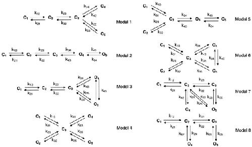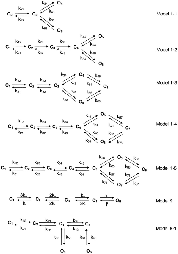 Figure 13. Simplified and expanded versions of Model 1 from Fig. 11 (1-1, 1-2, 1-3, and 1-4), and other kinetic models (9 and 8-1) that have been used in the literature. |