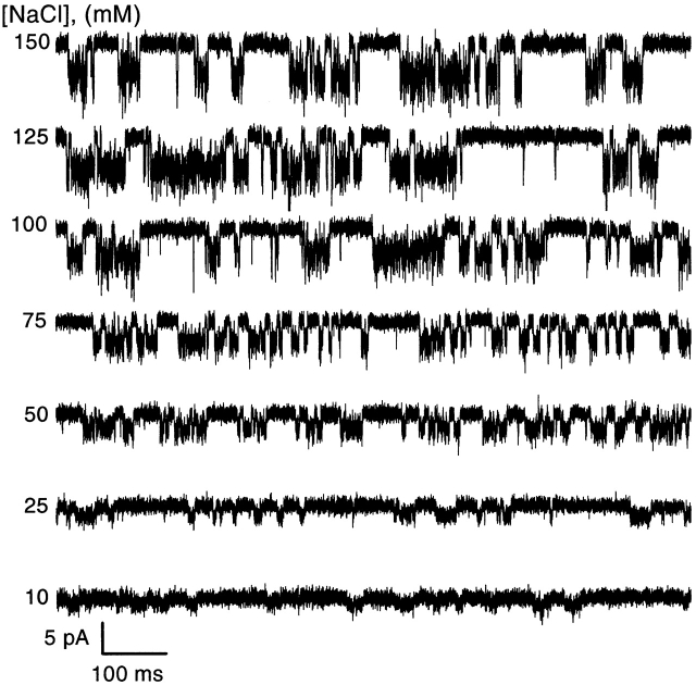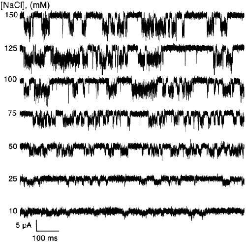 Figure 5. The effect of extracellular NaCl concentration on the single channel current amplitude. Currents activated by 15 μM ATP were recorded from an outside-out patch from a Xenopus oocyte with different concentrations of NaCl without ionic substitution (different ionic strength) in the absence of Ca2+ at −120 mV. The data were digitized at 20 kHz and low pass filtered at 10 kHz. |