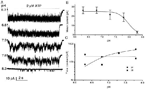 Figure 8. The effect of pH on the affinity of channel for ATP. (A) Multiple-channel currents from an outside-out patch of HEK cells at −120 mV and 2 μM ATP at different values of extracellular pH (0.3 mM extracellular Ca2+). Note the increase in rise time with increasing pH. The data were low pass filtered at 5 kHz and digitized at 10 kHz. The horizontal bar indicates the duration of ATP application. (B) The effect of pH on mean patch current. The data were fitted by the Hill equation with a maximum mean current of 25.1 pA, an EC50 of pH 7.9 (pKa), and a Hill coefficient of 2.5. The error bars are the standard deviation of the data and contain both open channel and gating noise. (C) The pH dependence of the rise and fall times. The time constants for rising (•) and falling (▪) phase were obtained from fitting single exponential functions (solid lines) to multiple channel currents. |