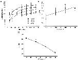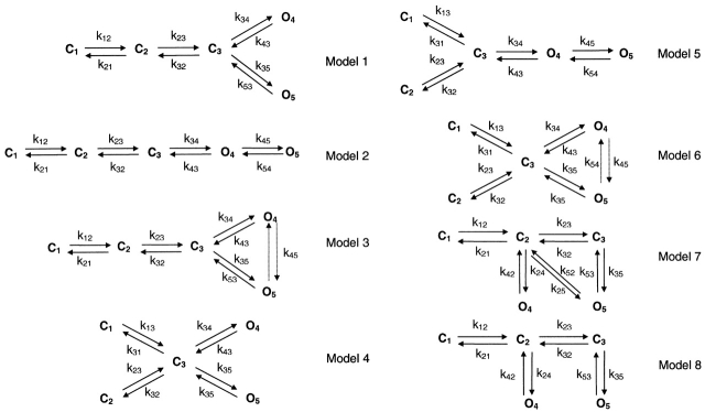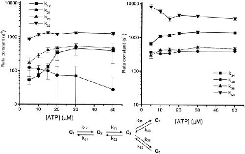 Figure 12. The effect of ATP concentration on the rate constants near the open states. The rate constants are based on kinetic Model 1 (shown at bottom), with each data set fit separately. Missed events were corrected by imposing a dead time of 0.05 ms. k12 and k23 are the most sensitive to the concentration of ATP, increasing over the range from 5 to 20 μM, and saturating at higher concentrations. The rate constants are plotted in two panels to avoid overlap (the scales in both plots are identical). |