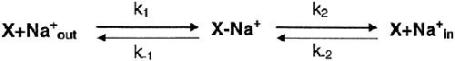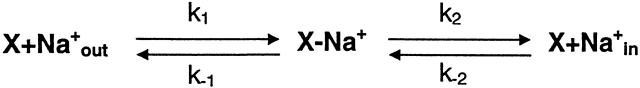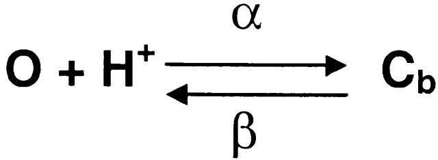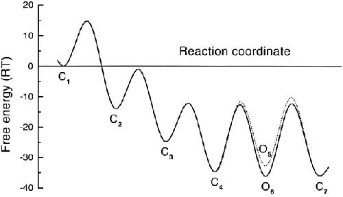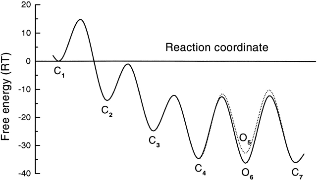 Figure 14. Representation of the channel activation pathway in terms of energy barriers and wells based on Model 1-4 (Fig. 13). The free energy landscape of the reaction scheme calculated from the transition rates. The relation between kij and free energy is defined by the Eyring equation: (kijs in this case are the rate constants at −120 mV). κ is the transmission coefficient (assumed to be 1; Hille, 1992), kB is Boltzmann's constant, h is Planck's constant, and T is the absolute temperature. At 20°C, kBT/h equals 6.11 × 1012 s−1. Gij is the free energy at the top of the barrier between states i and j, and Gi is the free energy of state i. The free energies are arbitrarily referenced to a solution of 1 M ATP. The use of kBT/h as the preexponential term of the rates is undoubtedly far off for a macromolecule. However, it is a maximum estimate that will cause the energy barriers to also be maximal estimates. The relationship of the well (state) energies, however, is much more likely to be correct since these energies are determined by ratios of rate constants where the preexponential terms will tend to cancel. |