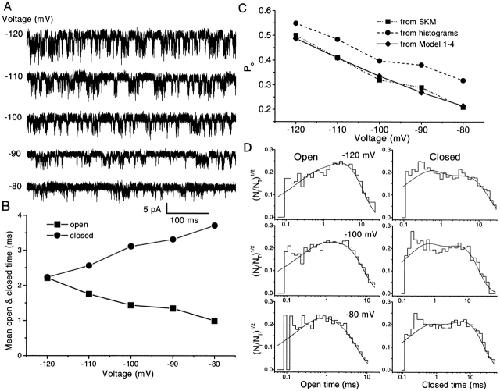 Figure 15. The effect of voltage on the single channel currents, mean open and closed times, and Po. (A) Single-channel currents activated by 30 μM ATP were recorded at different membrane potentials. Other conditions were the same as in Fig. 4. All the current traces in this figure are from the same patch. The currents were idealized for further kinetic analysis after filtering at 5 kHz using a Gaussian digital filter. (B) Mean open and closed times extracted from the idealized currents as a function of voltage. (C) The probability of being open, Po, as function of voltage calculated from idealized currents (▪), all-points histograms (•), and the prediction by Fig. 13, Model 1-4 (♦). Po from the histogram is slightly larger than that from idealized currents, indicating that some short-lived openings were missed during idealization. Po predicted by Model 1-4 is close to Po from idealized currents. (D) The closed and open time histograms at different voltages. The solid lines in the histograms are predicted probability density functions based on Model 1-4. Ni/NT has the same meaning as in Fig. 10 C. |