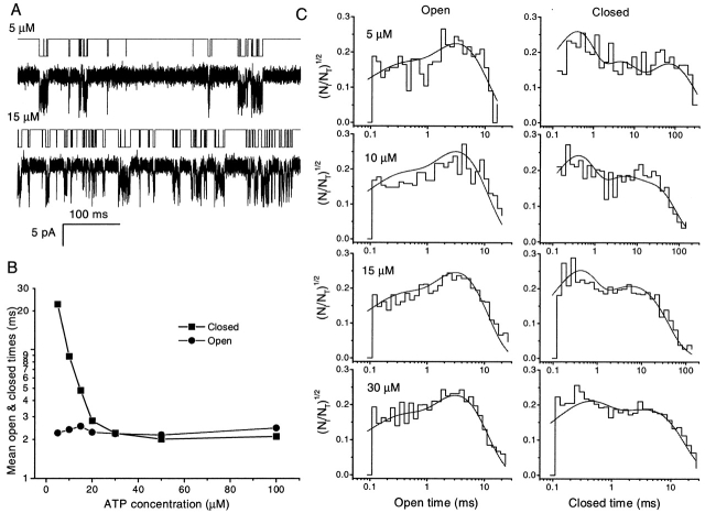 Figure 10. Idealization and open- and closed-interval duration histograms of single channel currents activated by different ATP concentrations (from the data in Fig. 4 A). (A) Examples of idealized single channel currents activated by 5 and 15 μM ATP. These data were recorded at 40 kHz and filtered at 20 kHz. Before idealization, the data were further filtered at 5 kHz using a Gaussian digital filter. The idealization was performed with the segmental k-means method based on a two-state model (see materials and methods). (B) The mean open and closed times of single channel currents as a function of ATP concentration. (C) The open- and closed-time histograms of single channel currents activated by different concentrations of ATP. The solid lines are the predicted probability density functions for Fig. 13, Model 1-4, with rate constants determined by global fitting across concentrations (see Table VIII). Ni/NT on the ordinate is the ratio of the number of events per bin to the total number of events. |