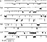 Figure 7. The effect of different permeant ions on the single channel currents. Single channel currents from HEK 293 cells at −120 mV activated by 2 μM ATP in the presence of 1 mM Mg2+ and Ca2+ from an outside-out patch. The data were filtered at 5 kHz and digitized at 10 kHz. |