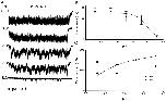 Figure 4. The effect of ATP concentration on single channel currents. (A) Single channel currents of P2X2 receptors expressed in Xenopus oocytes activated by different concentrations of ATP in the absence of extracellular Ca2+ (−120 mV). The data were filtered at 20 kHz and sampled at 40 kHz. All of the current traces in this figure are from the same patch. (B) All-points amplitude histograms of the currents from A (0.05 pA/bin), with the distributions fit to the sum of two Gaussians. At this bandwidth, the excess channel noise was ∼45% of the mean channel amplitude. (C) ATP dose–response curves. The probability of a channel being open is shown from experimental data (○) and simulated data generated by Fig. 13, Models 1-2 (⋄) and 1-4 (□), as a function of ATP concentration. Fits of the data sets to the Hill equation are shown as dotted (experimental data), dash dot (Model 1-2), and solid (Model 1-4) lines. The Hill coefficient = 2.3, EC50 = 11.0 μM, and maximum Po = 0.61 for the experimental data, 1.5, 17.4 μM, and 0.74 for simulated data of Model 1-2, and 1.8, 13.3 μM, and 0.64 for simulated data of Model 1-4. All the experimental data were from same patch. The errors in the experimental Po were estimated from the errors in the mean and standard deviation estimates reported by Origin when fitting the amplitude histograms to Gaussians. |