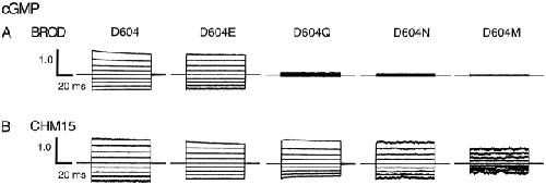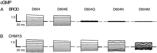 Figure 2. Current families for wild-type and mutant channels activated by cGMP. Current families are shown from inside-out patches excised from Xenopus laevis oocytes expressing BROD (A) and CHM15 (B) channels with mutations at position 604. Currents were elicited by 16 mM cGMP and voltage pulses from 0 mV to potentials between −80 and +80 mV in 20-mV steps. Leak currents in the absence of cyclic nucleotides were subtracted. The currents were normalized (using the +80-mV trace) to the maximum current obtained after Ni2+ potentiation (Gordon and Zagotta, 1995a) in the presence of a saturating concentration of the best agonist. |