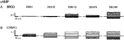 Figure 4. Current families for wild-type and mutant channels activated by cAMP. Current families are shown from inside-out patches excised from Xenopus laevis oocytes expressing BROD (A) and CHM15 (B) channels with mutations at position 604. Currents were elicited by 16 mM cAMP and voltage pulses from 0 mV to potentials between −80 and +80 mV in 20-mV steps. Leak currents in the absence of cyclic nucleotides were subtracted. The currents were normalized (using the +80-mV trace) to the maximum current obtained after Ni2+ potentiation (Gordon and Zagotta, 1995a) in the presence of a saturating concentration of the best agonist. |