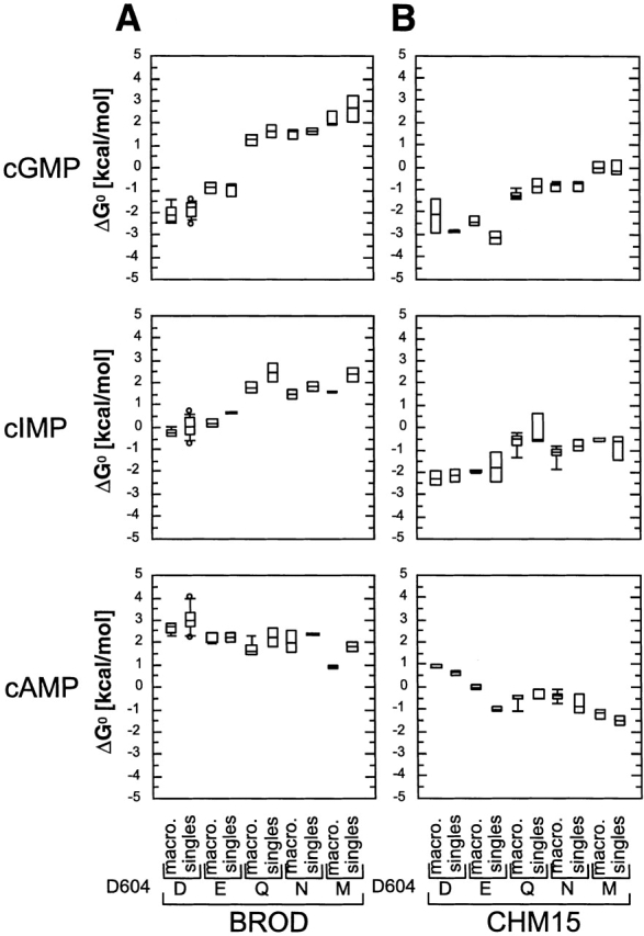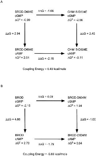 Figure 5. Thermodynamic mutant cycles identify direct interactions between cyclic nucleotides and D604. (A) The effect of substituting the olfactory amino terminal region for the BROD amino terminal region was cyclic nucleotide independent. (B) The effect of mutating D604 to D604M was strongly cyclic nucleotide dependent, indicating that the amino acid at position 604 is critical for cGMP vs. cAMP discrimination by the channel. |