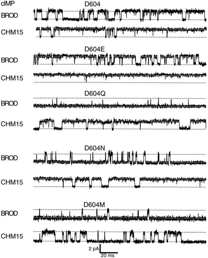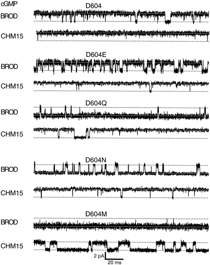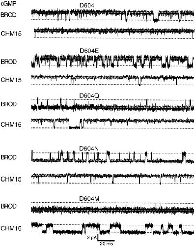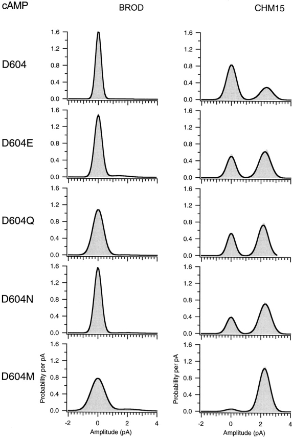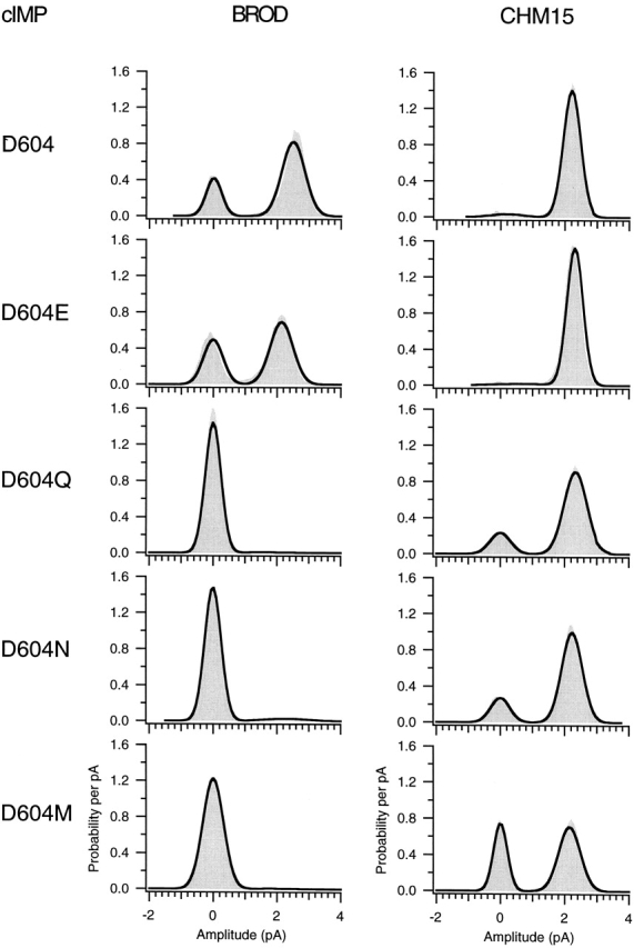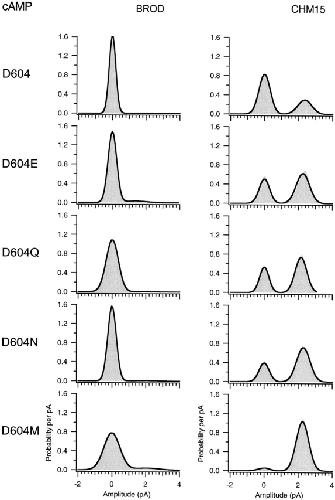 Figure 7. Amplitude histograms for activation by a saturating concentration of cGMP. Amplitude histograms corresponding to the representative traces in Fig. 6 are shown. The histograms were fit to the sum of two Gaussians, and the peak of the closed level Gaussian was used to subtract off leak currents. The parameters for the amplitude histograms were as follows: for BROD, σclosed = 480 fA, σopen = 560 fA, Popen = 0.95; for CHM15, σclosed = 1.6 pA, σopen = 340 fA, Popen = 0.99; for BROD-D604E, σclosed = 490 fA, σopen = 430 fA, Popen = 0.71; for CHM15-D604E, σclosed = 850 fA, σopen = 240 fA, Popen = 0.97; for BROD-D604Q, σclosed = 380 fA, σopen = 890 fA, Popen = 0.06; for CHM15-D604Q, σclosed = 240 fA, σopen = 270 fA, Popen = 0.91; for BROD-D604N, σclosed = 270 fA, σopen = 560 fA, Popen = 0.07; for CHM15-D604N, σclosed = 260 fA, σopen = 290 fA, Popen = 0.92; for BROD-D604M, σclosed = 440 fA, σopen = 1.33 pA, Popen = 0.003; for CHM15-D604M, σclosed = 270 fA, σopen = 390 fA, Popen = 0.42. |