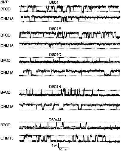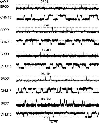 Figure 9. Amplitude histograms for activation by a saturating concentration of cIMP. Amplitude histograms corresponding to the representative traces in Fig. 8 are shown. The histograms were fit to the sum of two Gaussians, and the peak of the closed level Gaussian was used to subtract off leak currents. The parameters for the amplitude histograms were as follows: for BROD, σclosed = 240 fA, σopen = 360 fA, Popen = 0.74; for CHM15, σclosed = 530 fA, σopen = 270 fA, Popen = 0.96; for BROD-D604E, σclosed = 300 fA, σopen = 360 fA, Popen = 0.62; for CHM15-D604E, σclosed = 930 fA, σopen = 250 fA, Popen = 0.96; for BROD-D604Q, σclosed = 250 fA, σopen = 610 fA, Popen = 0.011; for CHM15-D604Q, σclosed = 320 fA, σopen = 360 fA, Popen = 0.81; for BROD-D604N, σclosed = 260 fA, σopen = 650 fA, Popen = 0.044; for CHM15-D604N, σclosed = 290 fA, σopen = 320 fA, Popen = 0.80; for BROD-D604M, σclosed = 320 fA, σopen = 610 fA, Popen = 0.009; for CHM15-D604M, σclosed = 210 fA, σopen = 340 fA, Popen = 0.59. |