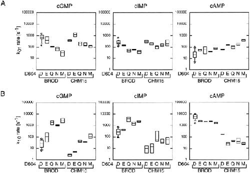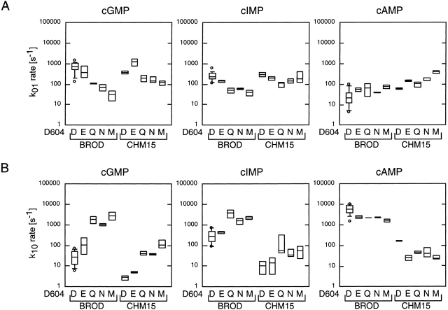 Figure 12. Box plot summaries for k01 and k10. Box plots of the k01 (A) and k10 (B) rate constants for the C0 ↔ O1 ↔ C2 scheme are shown for all 10 constructs for cGMP, cIMP, and cAMP. Values for the rate constants were determined by HMM analysis. The horizontal line within each box indicates the median of the data; boxes show the 25th and 75th percentiles of the data; whiskers show the 5th and 95th percentiles. Extreme data points are also indicated. |
