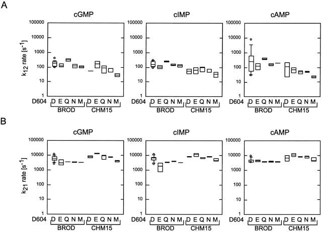 Figure 13. Box plot summaries for k12 and k21. Box plots of the k12 (A) and k21 (B) rate constants for the C0 ↔ O1 ↔ C2 scheme are shown for all 10 constructs for cGMP, cIMP, and cAMP. Values for the rate constants were determined by HMM analysis. |