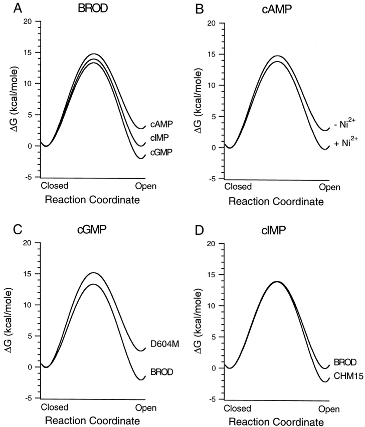 Figure 15. Free energy profile for the allosteric transition. The free energy profiles for the allosteric transition (C0 ↔ O1) are illustrated based on the median values of the rate constants determined from HMM analysis of the single-channel currents. The rate constants were converted to energies using simple transition-state theory, with the highest energy intermediate postulated to break down to product at the vibrational frequency of a covalent bond. (A) Free energy profiles for cGMP, cIMP, and cAMP on BROD channels. (B) Free energy profiles for cAMP with and without Ni2+. (C) The free energy profiles of the allosteric transition for BROD and BROD-D604M channels activated by a saturating concentration of cGMP. (D) The free energy profiles of the allosteric transition for BROD and CHM15 channels activated by a saturating concentration of cIMP. |