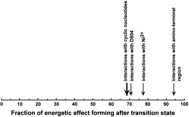 Figure 16. Fraction of energetic effect occurring after the allosteric transition. The fraction of the energetic effect occurring after the allosteric transition was calculated as ΔΔG‡/ΔΔG0 = |(ΔG‡1 − ΔG‡2)/(ΔG01 − ΔG02)|, where ΔG‡ is the activation energy for the closing transition, ΔG0 is the standard free energy for the allosteric transition, and the subscript indicates the different conditions of allosteric modulation. ΔGs were the median values determined from an HMM analysis of the single-channel currents. The ΔΔG‡/ΔΔG0 for the interactions with different cyclic nucleotides was the average of the values for BROD channels between cGMP and cIMP, cGMP and cAMP, and cIMP and cAMP. The ΔΔG‡/ΔΔG0 for the interactions with D604 was the average of the values between BROD channels and D604M channels and between CHM15 channels and CHM15-D604M channels for all three cyclic nucleotides. The ΔΔG‡/ΔΔG0 for the interactions with Ni2+ was the average of the values between BROD channels with and without Ni2+ for cIMP and cAMP (Sunderman and Zagotta, 1999). The ΔΔG‡/ ΔΔG0 for the interactions with the amino terminal region was the average of the values between BROD channels and CHM15 channels for all three cyclic nucleotides. |