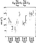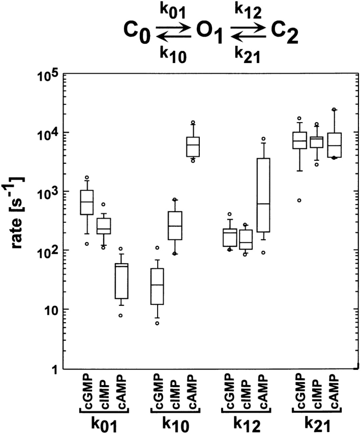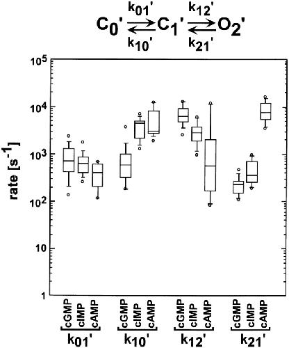 Figure 13. Box plots of rate constants for the C0′ ↔ C1′ ↔ O2′ scheme. Box plots of the k01′, k10′, k12′, and k21′ rate constants for the C0′ ↔ C1′ ↔ O2′ scheme from 14 different patches. Values for the rate constants were determined by HMM analysis. The horizontal line within each box indicates the median of the data, boxes show the 25th and 75th percentiles of the data, and whiskers show the 5th and 95th percentiles. Extreme data points are also indicated. |