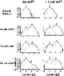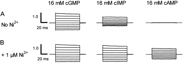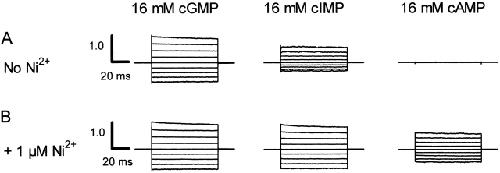 Figure 3. Macroscopic current– voltage families. Current families for an inside-out patch were elicited by 16 mM cGMP, 16 mM cIMP, or 16 mM cAMP in the presence (A) or absence (B) of 1 μM Ni2+. Voltage pulses were applied from 0 mV to potentials between −80 and +80 mV in 20-mV steps. Control currents in the absence of cyclic nucleotides were subtracted. The currents were normalized (using the +80-mV trace) to the maximum current in the presence of 16 mM cGMP and 1 μM Ni2+. |