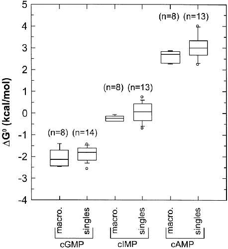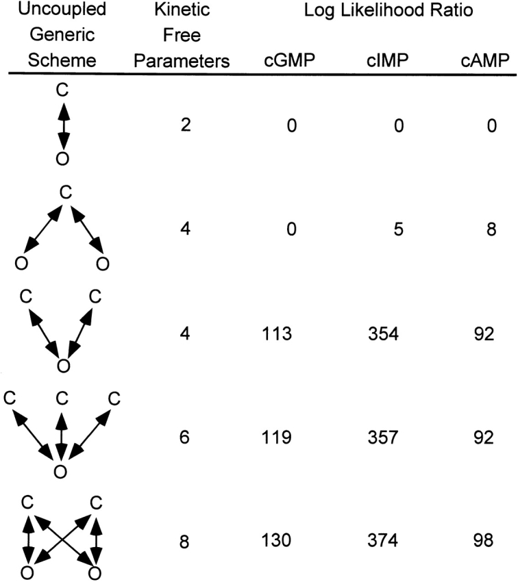 Figure 12. Model discrimination. Log likelihood ratios from an HMM analysis with five uncoupled generic schemes of single channel data recorded with 16 mM cGMP, cIMP, or cAMP. A convergence criterion of 10−8 was used. The log-likelihoods obtained from the analysis were normalized by subtracting the log-likelihoods obtained for the two-state C ↔ O scheme. |