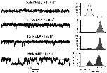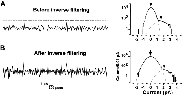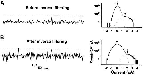 Figure 6. Effects of inverse filtering on cAMP openings. Representative cAMP current traces at +80 mV are shown before (A) and after (B) inverse filtering along with amplitude histograms shown on log-linear axes. The dotted lines on the traces are separated by 2.2 pA. The amplitude histograms were fit by the sum of two Gaussians, which appear as parabolas on log-linear axes. The fit parameters before inverse filtering were: μopen = 1.5 pA, σclosed = 0.29 pA, σopen = 0.65 pA, Popen = 0.006. The fit parameters after inverse filtering were μopen = 2.1 pA, σclosed = 0.49 pA, σopen = 0.61 pA, Popen = 0.004. |