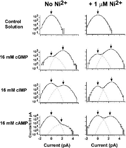 Figure 7. Amplitude histograms on log–linear axes with inverse filtering. The amplitude histograms were fit by the sum of two Gaussians, which appear as parabolas on a log scale. Parameters for the histograms in the absence of Ni2+ were as follows: control solution: σclosed = 480 fA; 16 mM cGMP: σclosed = 580 fA, Pclosed = 0.045, μopen = 2.2 pA, σopen = 590 fA, Popen = 0.955; 16 mM cIMP: σclosed = 490 fA, Pclosed = 0.71, μopen = 2.2 pA, σopen = 640 fA, Popen = 0.286; 16 mM cAMP: σclosed = 500 fA, Pclosed = 0.989, μopen = 2.0 pA, σopen = 960 fA, Popen = 0.011. Parameters for the histograms in the presence of Ni2+ were as follows: control solution + 1 μM Ni2+: σclosed = 520 fA; 16 mM cGMP + 1 μM Ni2+: σclosed = 590 fA, Pclosed = 0.036, μopen = 2.4 pA, σopen = 600 fA, Popen = 0.964; 16 mM cIMP + 1 μM Ni2+: σclosed = 470 fA, Pclosed = 0.071, μopen = 2.4 pA, σopen = 500 fA, Popen = 0.929; 16 mM cAMP + 1 μM Ni2+: σclosed = 510 fA, Pclosed = 0.525, μopen = 2.2 pA, σopen = 620 fA, Popen = 0.475. |