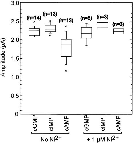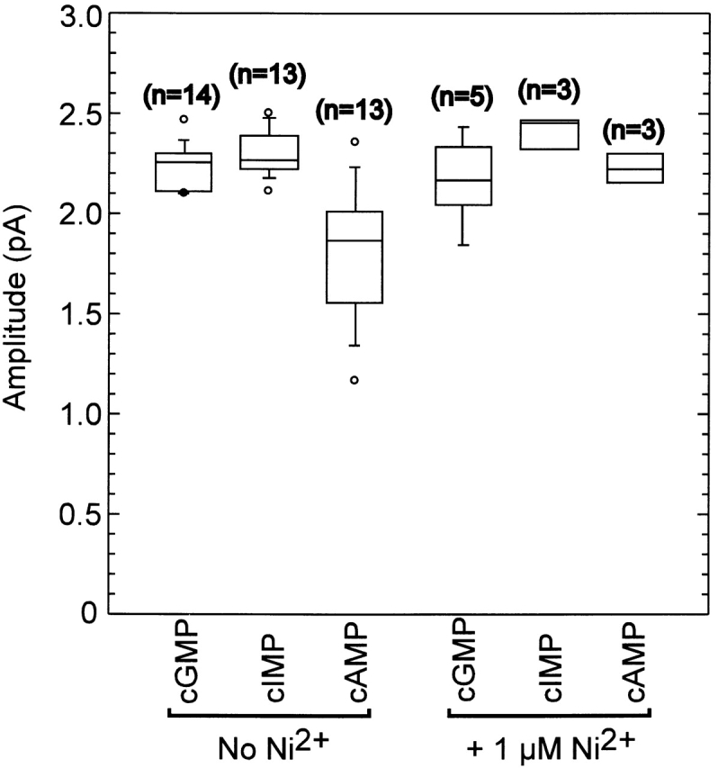 Figure 8. Single-channel amplitude variation across experiments. Box plots of the values for the single-channel amplitude as determined by fitting the sum of two Gaussians to inverse-filtered data. The horizontal line within each box indicates the median of the data; boxes show the 25th and 75th percentiles of the data; whiskers show the 5th and 95th percentiles. Extreme data points are also indicated. The median single-channel conductance was 2.25 pA for cGMP, 2.27 pA for cIMP, 1.87 pA for cAMP, 2.15 pA for cGMP with Ni2+, 2.46 pA for cIMP with Ni2+, and 2.21 pA for cAMP with Ni2+. |
