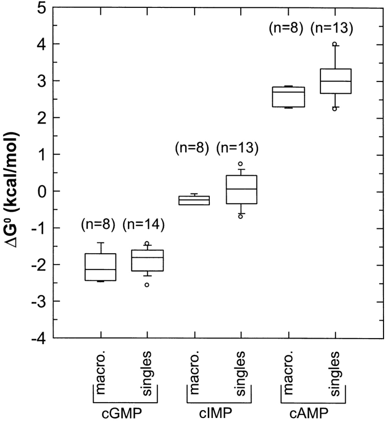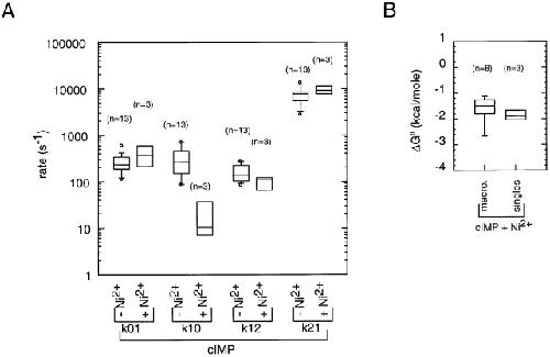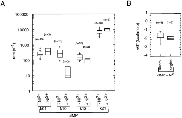 Figure 17. The effect of Ni2+ on HMM rate constants for cIMP. (A) Comparison of rate constants for cIMP with and without Ni2+. Values for the rate constants were determined by HMM analysis. The horizontal line within each box indicates the median of the data, boxes show the 25th and 75th percentiles of the data, and whiskers show the 5th and 95th percentiles. Extreme data points are also indicated. (B) Comparison of values for ΔG0 for activation by cIMP in the presence of Ni2+ between macroscopic and single-channel experiments. |