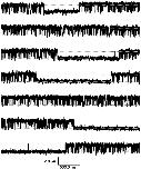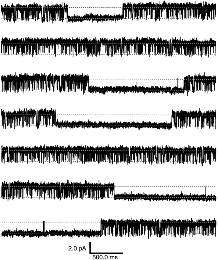 Figure 1. Bimodal single-channel activity. Shown are 23.33 s of a continuous current recording from a patch containing a single BROD CNG channel. The upper and lower dotted lines, separated by 2.1 pA, indicate the open and closed current levels, respectively. The currents were recorded at +80 mV in the inside-out configuration and in the continuous presence of 16 mM cGMP applied to the cytoplasmic face of the patch. The data were filtered at 5 kHz and sampled at 25 kHz. |