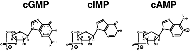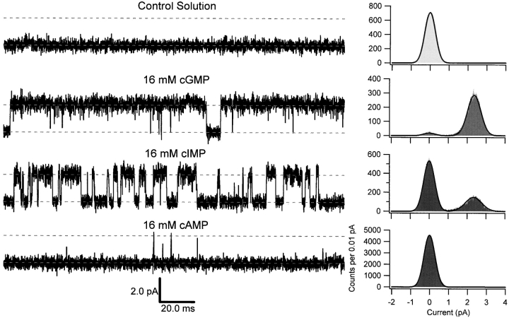 Figure 4. Representative single-channel currents. Single-channel currents were recorded in the presence of 16 mM cGMP, cIMP, or cAMP with the membrane voltage clamped at +80 mV. Each sweep was 200 ms in duration. The upper and lower dotted lines indicate the open and closed levels, respectively, and are separated by 2.3 pA. The amplitude histograms were normalized to unit area and were fit by the sum of two Gaussians with variances σclosed2 and σopen2 for the closed and open distributions, respectively. Parameters for amplitude histograms were as follows: control solution: σclosed = 280 fA; 16 mM cGMP: σclosed = 300 fA, Pclosed = 0.05, μopen = 2.4 pA, σopen = 349 fA, Popen = 0.95; 16 mM cIMP: σclosed = 289 fA, Pclosed = 0.71, μopen = 2.3 pA, σopen = 431 fA, Popen = 0.29; 16 mM cAMP: σclosed = 287 fA, Pclosed = 0.997, μopen = 2.4 pA, σopen = 500 fA, Popen = 0.003. |